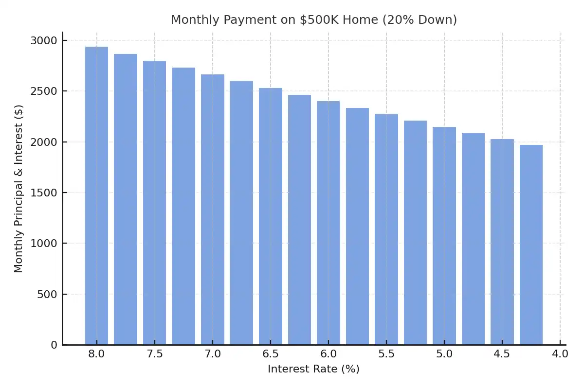 A 1% drop in mortgage rates typically reduces payments by 10–12%—or increases buying power by the same amount.