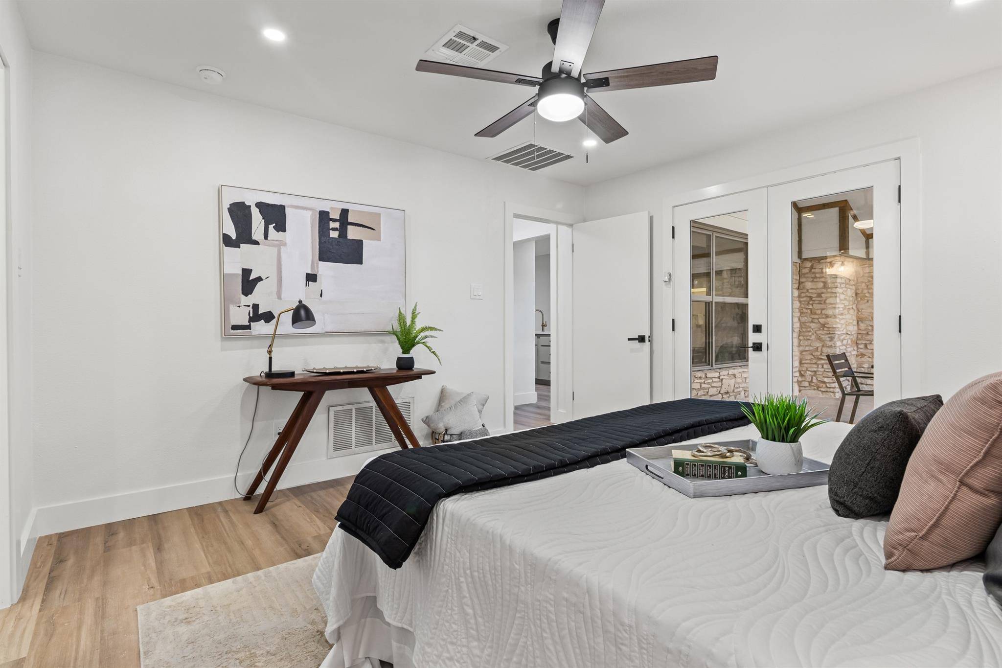 Step inside to discover a completely updated kitchen and bathrooms, featuring modern finishes and elegant quartz countertops throughout. The spacious layout offers excellent separation, with the primary suite thoughtfully positioned away from the additional bedrooms, providing privacy and peaceful retreat.